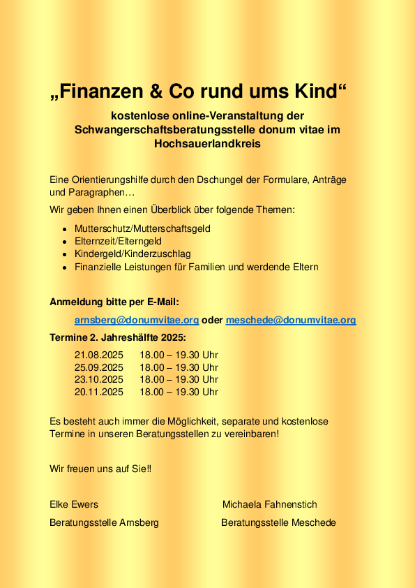 Unsere Beratungsstelle bietet eine digitale Gruppenveranstaltung zum Thema "Finanzen & Co. rund ums Kind" an, in der wir finanzielle Ansprüche und rechtliche Aspekte rund um das Thema Schwangerschaft und Geburt erklären und den Teilnehmern für Fragen zur Verfügung stehen.